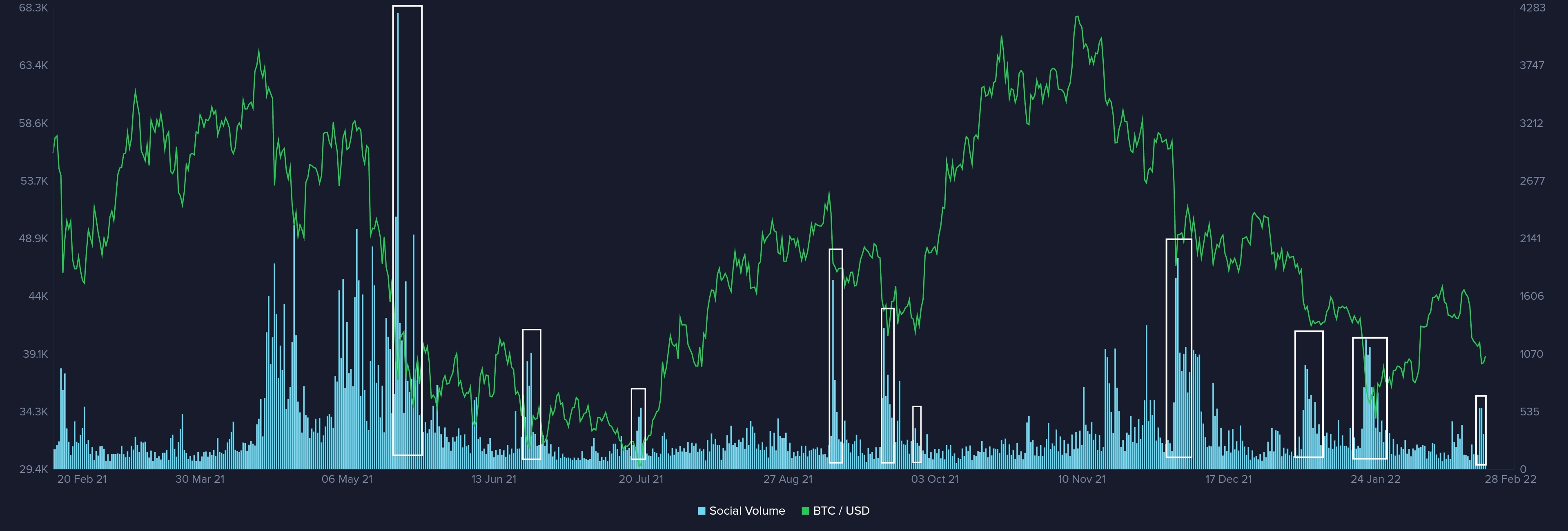 例如,去年 5 月中旬,由于中国的比特币挖矿禁令和埃隆马斯克相关的恐慌导致比特币价格开始暴跌,大约 68,000 名线上交易员提到在 BTC 跌至 44,000 美元左右时买入下跌。然而,底部直到 7 月下旬才出现,当时 BTC 的价格约为 29,000 美元。