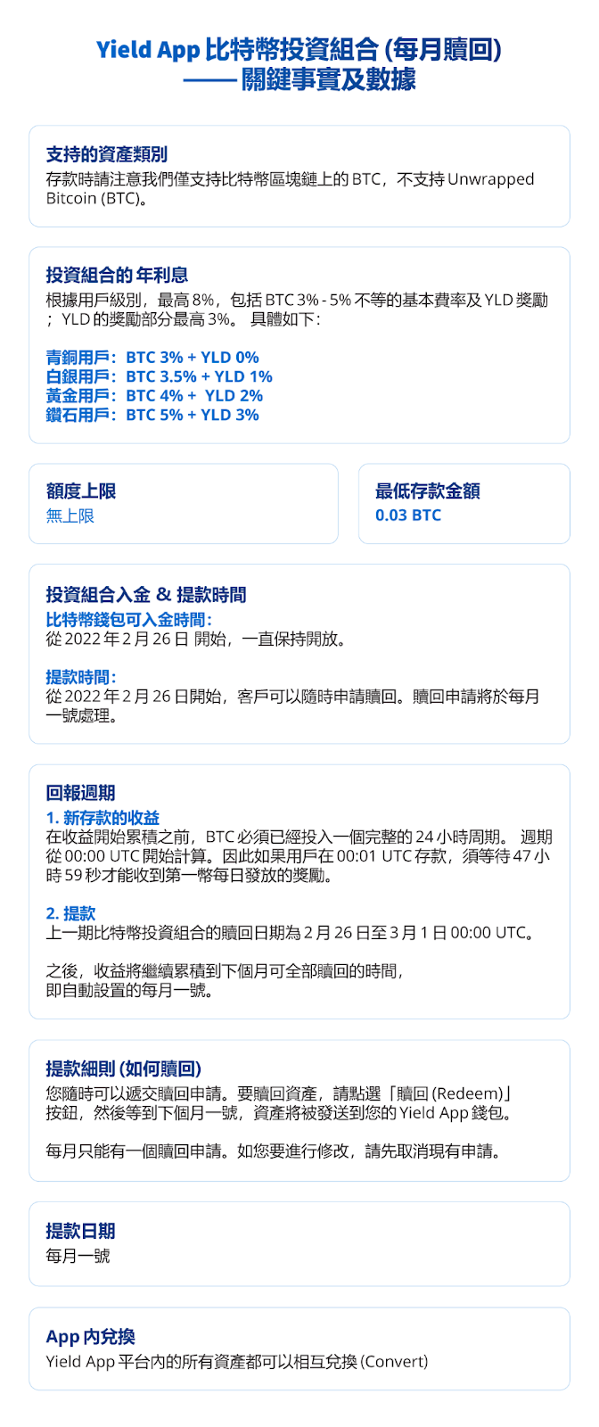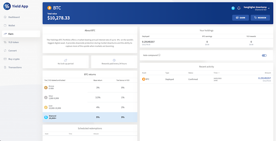 于 2022 年 2 月 26 日(上周六)𫔭始,您可以随时将 BTC 存入 Yield App 钱包,然后点击「收益(Earn)」 将资产投入到我们的比特币投资组合中。除此之外,您还可以随时设定赎回,然后每个月底赎回您的资产。
