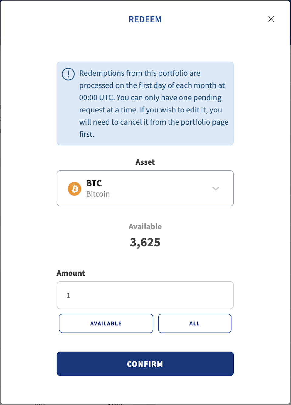 请注意,每个周期内您只能递交一个有效的提款申请。如果您想要撤回申请,请在月底前取消;如您想要修改赎回金额,必须先取消请求,然后再创建一个新请求。
