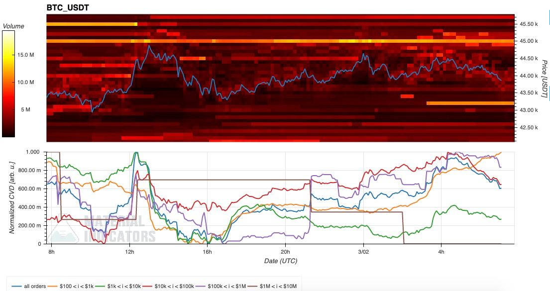 随着比特币价格的上涨,出价也随之小幅上升,目前的新需求约为43,200美元。与此同时,4.5万美元仍是卖方压力的主要区域。