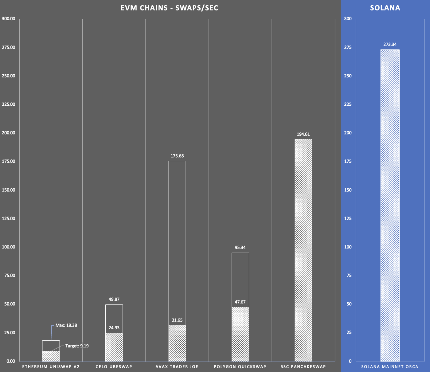 实验结果已于3月2日公布。它试图通过测量原生自动做市商上的每个区块可以进行多少次交换来比较区块链的吞吐量。AMM是指可促进链上非托管代币交换的去中心化交易所(DEX),如Uniswap和PancakeSwap。