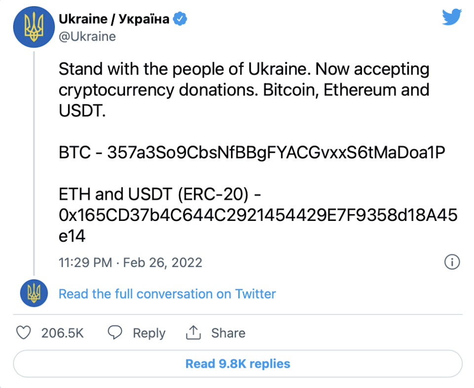乌克兰官方 Twitter 放出加密货币捐赠地址|Twitter