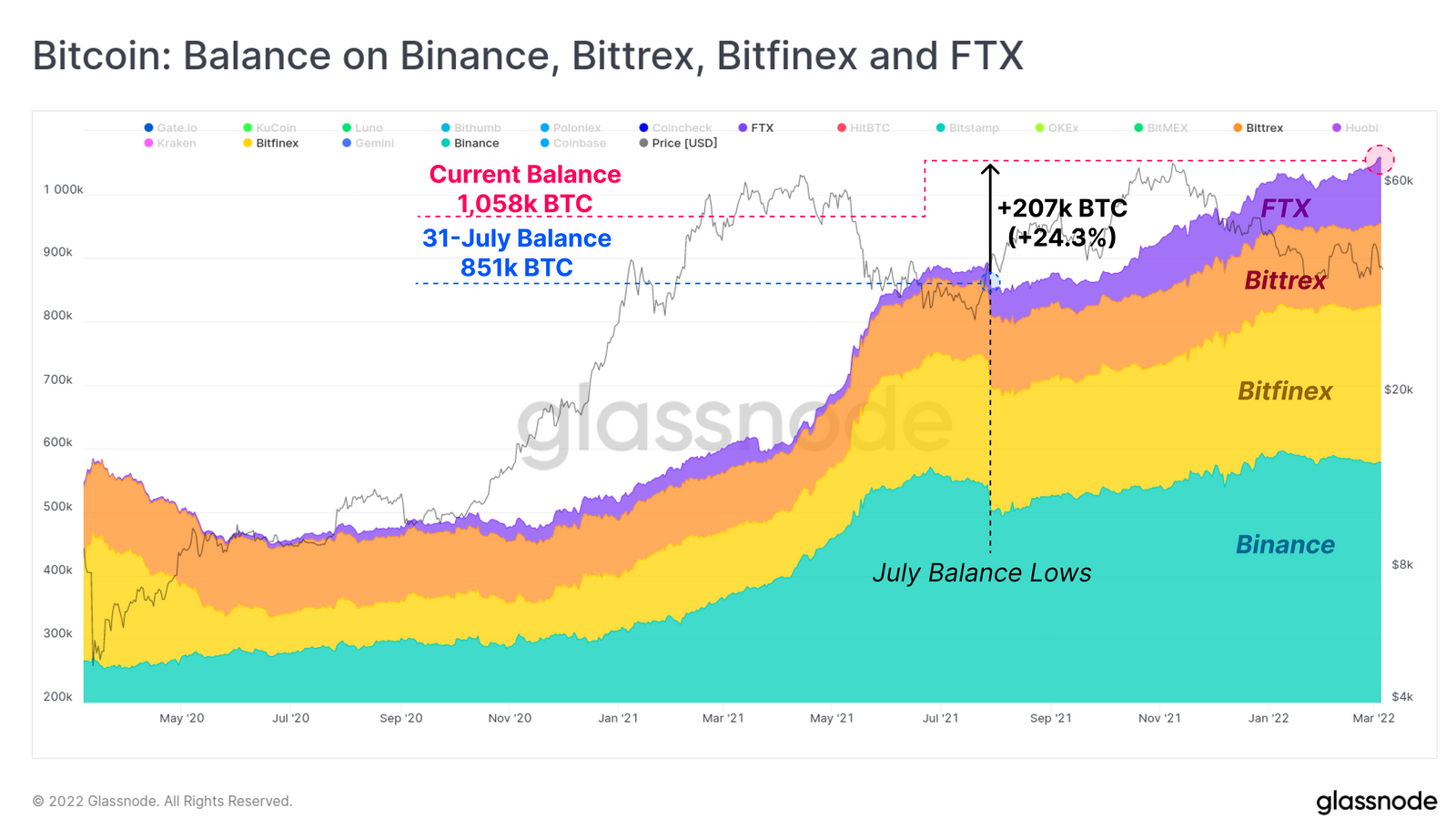 自 2021 年 7 月以来,FTX、Binance、Bittrex 和 Bitfinex 的比特币净流入为正 - Glassnode
