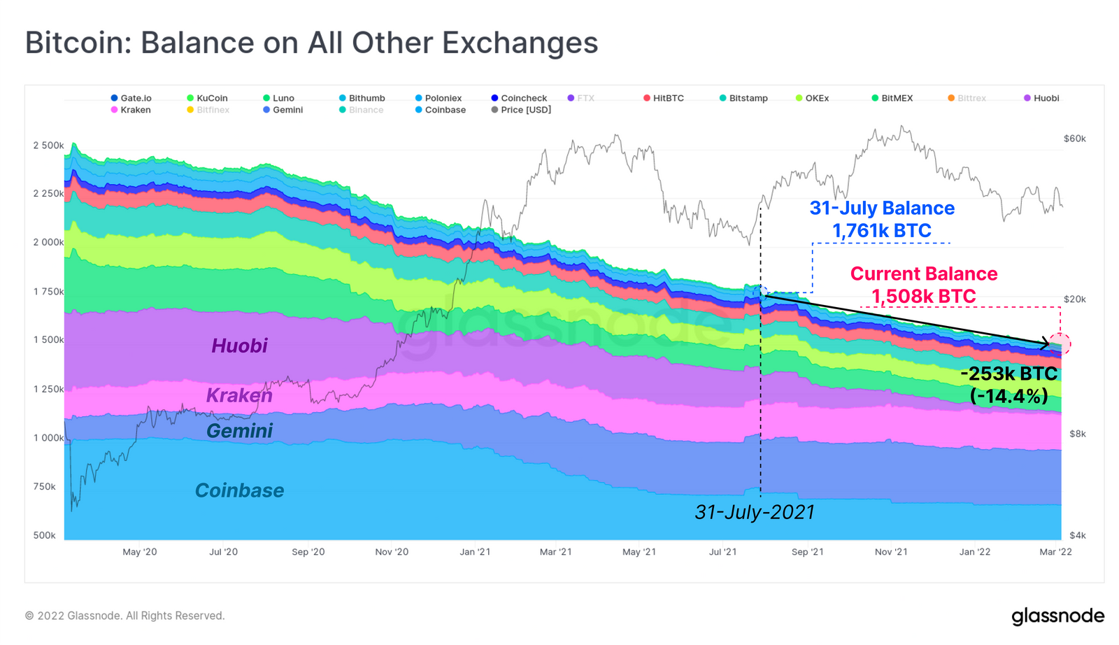 自 2021 年 7 月以来,大多数交易所都出现了 BTC 的净负流入 - Glassnode