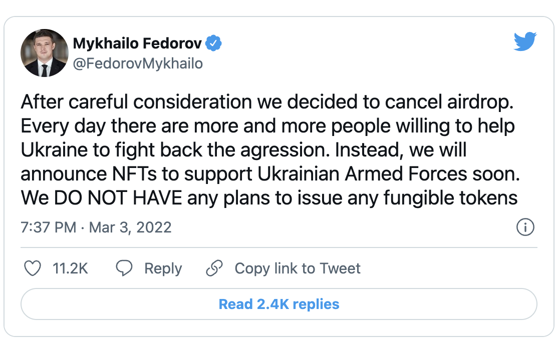 乌克兰政府表示,将发行非同质化代币 (NFT),为其军队提供资金,以抵御俄罗斯的侵略。