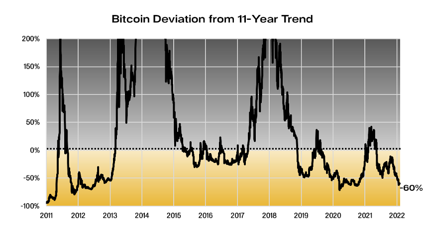 比特币的交易价格低于其11年的趋势--在其历史上,它只在12.7%的时间里处于这个区域 来源:Pantera Capital