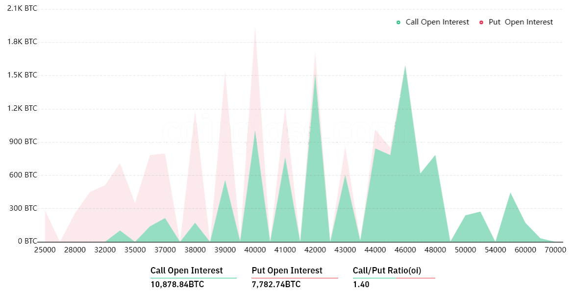 - 在 40,000 美元和 42,000 美元之间:2,600 个看涨期权与 2,100 个看跌期权。最终结果在看涨(看涨)和看跌(看跌)期权之间取得平衡。