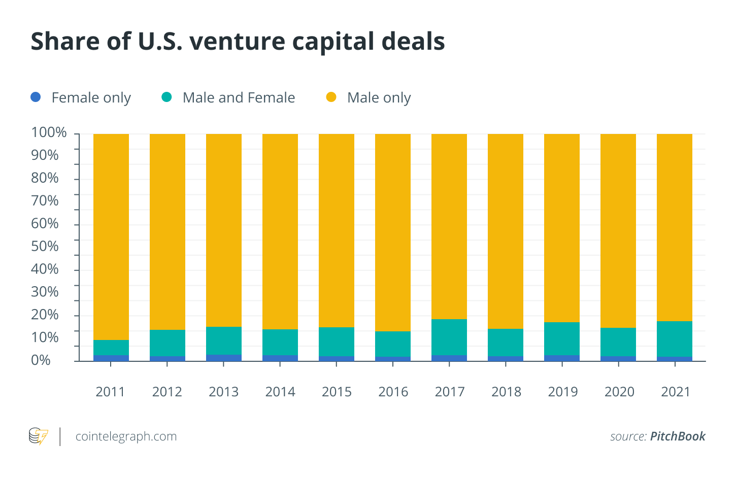 与此同时,由女性主导的项目得到的支持越来越少。尽管2021年加密风投资金总额创下历史新高,但女性风投基金的百分比却连续缩水两年。