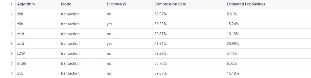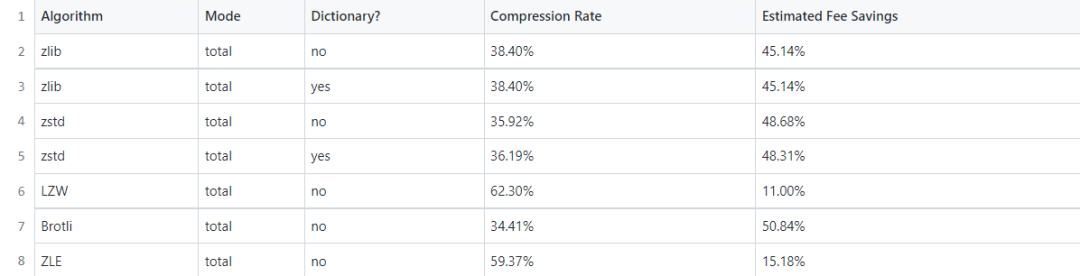 我们还研究了各种压缩算法,并计算了压缩率 (压缩后的数据大小占未压缩大小的百分比) 和预估节省的费用 (假设交易中 40% 的字节是 0 字节)。