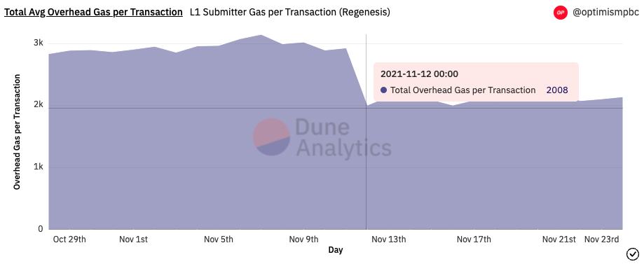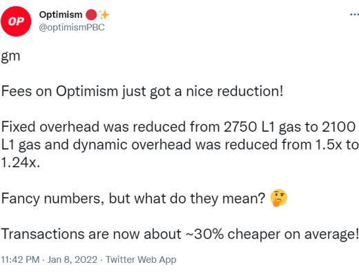 1. 更低的开销结构:由于 Optimism 在去年 11 月 11 日进行了 EVM 等同性 (EVM Equivalence) 升级,提交 Optimism 交易 batch 至 L1 需要的 gas 变少了。实际开销减少了将近 25%,从 2750 每笔交易降至 2100 gas 每笔交易。