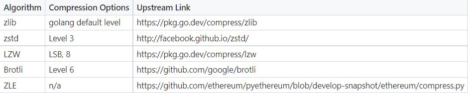 在比较不同的压缩算法时,我们发现 zlib、zstd 和 brotli 是压缩率最高的算法。我们排除了 Brotli 是因为在差不多的压缩率下,它比 zstd 或 zlib 慢得多。一般来说,某种算法的压缩率越高 (或某个算法的设置压缩率越高),这个算法就运行得越慢。在通用基准测试中,在比较过一系列压缩速度/压缩率之后,zstd 往往比其他压缩算法性能更好。还要注意的是,以太坊交易与基准测试中的数据具有不同的特征。
