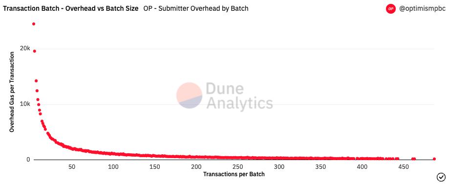 2. 开销:随着总 batch 的尺寸变大,在一个 batch 中添加一笔交易的开销会减少。这是 L2 扩容与 L1 扩容不同的一个地方:交易越多,交易费就越便宜。开销已经从 2750 gas 减少到 2100 gas,并会随着 Optimism 的使用率增加继续减少。