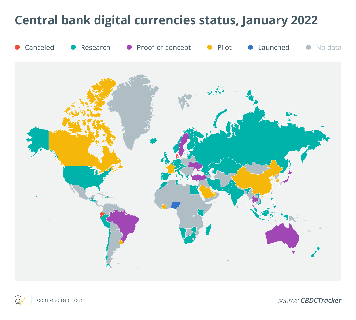 大西洋理事会开发了一种工具,跟踪所有国家的各种CBDC项目的发展阶段。乌克兰、中国、瑞典、南非、马来西亚、新加坡、泰国、韩国、沙特阿拉伯、阿拉伯联合酋长国和其他几个国家已经推出了各自CBDC的试点版本。与此同时,尼日利亚、巴哈马和东加勒比国家已经启动了它们的CBDC开发工作。