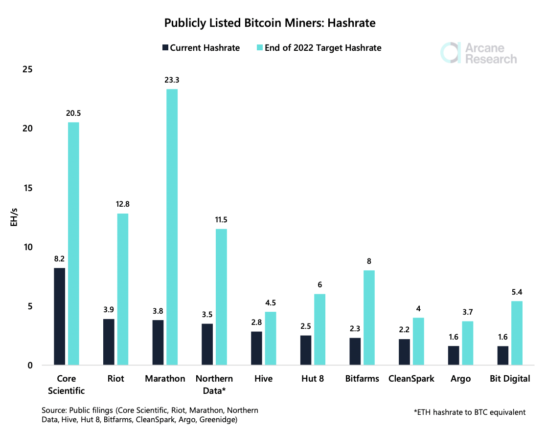 Arcane Research 的一份报告表明,公开上市的比特币矿商正在“不断寻找扩张机会”,因为他们“计划在 2022 年以比整个网络更快的速度增加算力”。