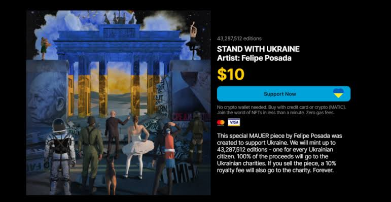 Forza Ikonia一直在帮助乌克兰的各种慈善机构筹集资金,包括Doctors Without Borders和Amnesty International。这个基辅和哥德堡的孵化器推出了NFT项目“Stand with Ukraine”,包括43,287,512个版本的NFT,由艺术家Felipe Posada设计。每个NFT代表一名乌克兰公民,售价仅为10美元。