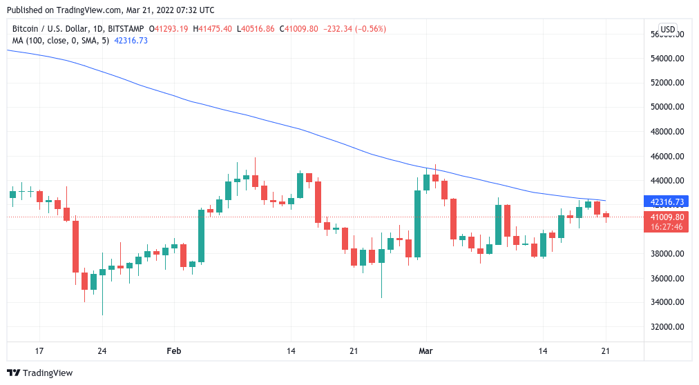 带有 100DMA(Bitstamp)的 BTC/USD 1 天蜡烛图 来源:TradingView