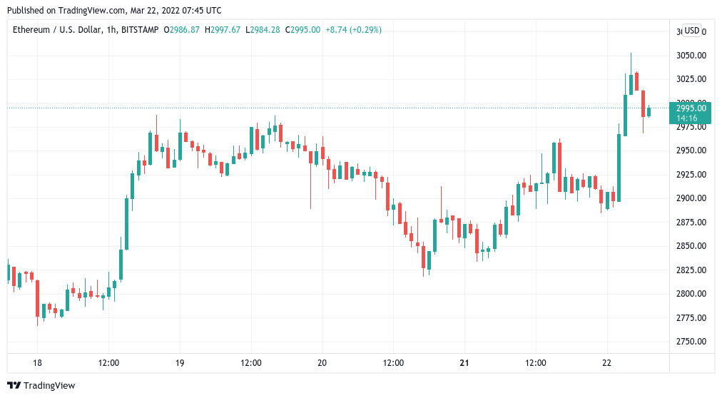最大的山寨币以太坊 (ETH) 跟随比特币的涨势,一度触及3000美元,但随后立即在这一重要的心理水平下方盘整。