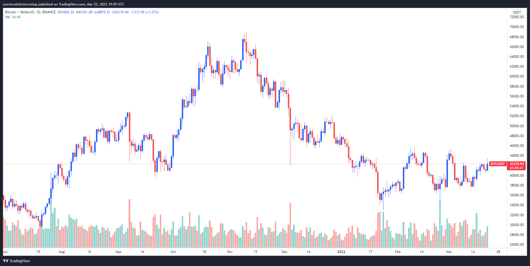 Cointelegraph Markets Pro 和 TradingView 的数据显示,比特币价格从周二凌晨 40,884 美元的低点上涨 6.15% 至盘中高点 43,380 美元,然后在 42,300 美元的支撑位附近盘整。