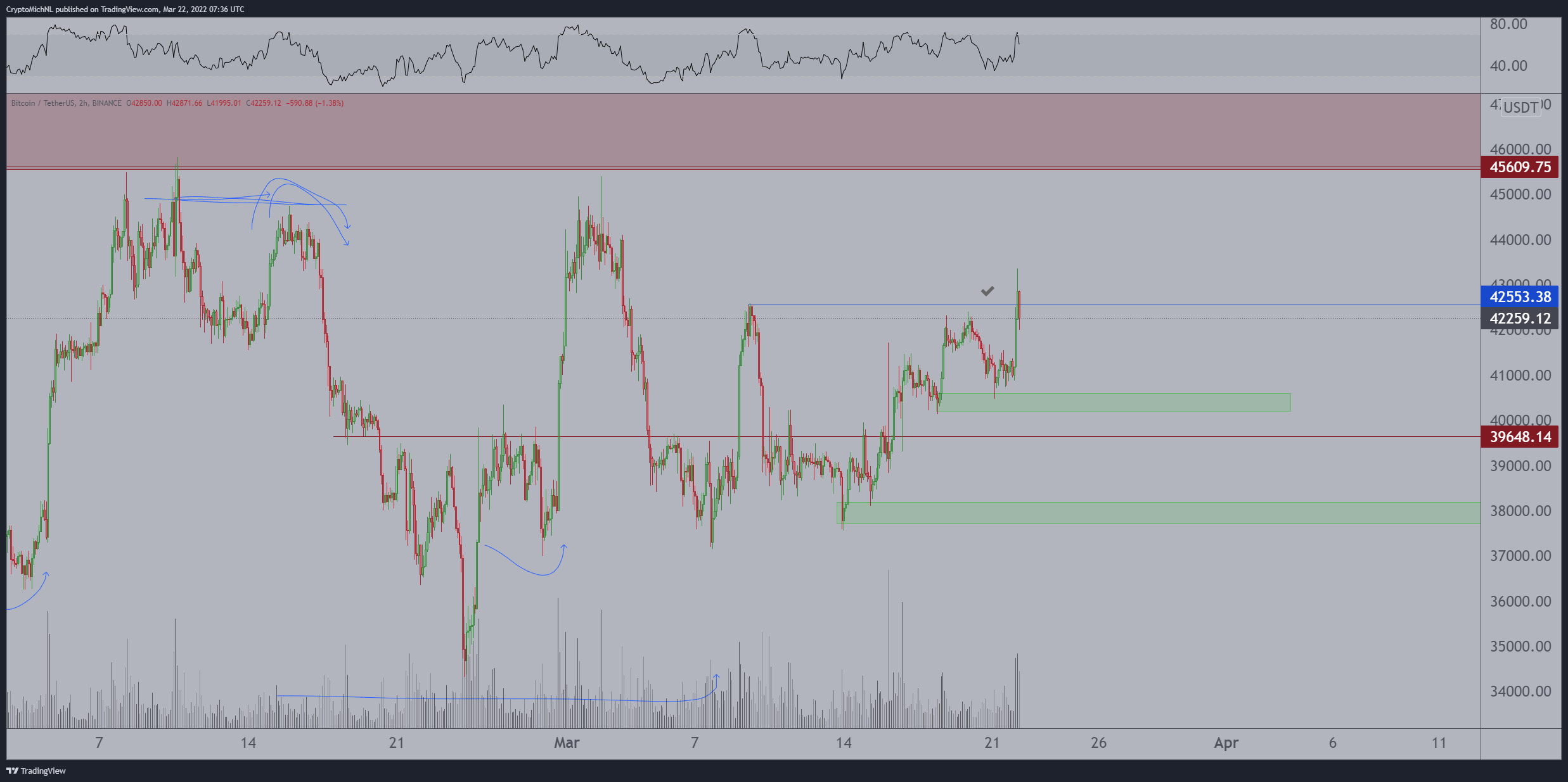 市场分析师和匿名推特用户“Rekt Captial”为 3 月 22 日比特币的走势进行了预测,他发布了以下图表,指出“如果比特币成功重新测试绿色虚线作为新的支撑位”,那么它“将冲向绿色 ~ 43100 美元的阻力位。”