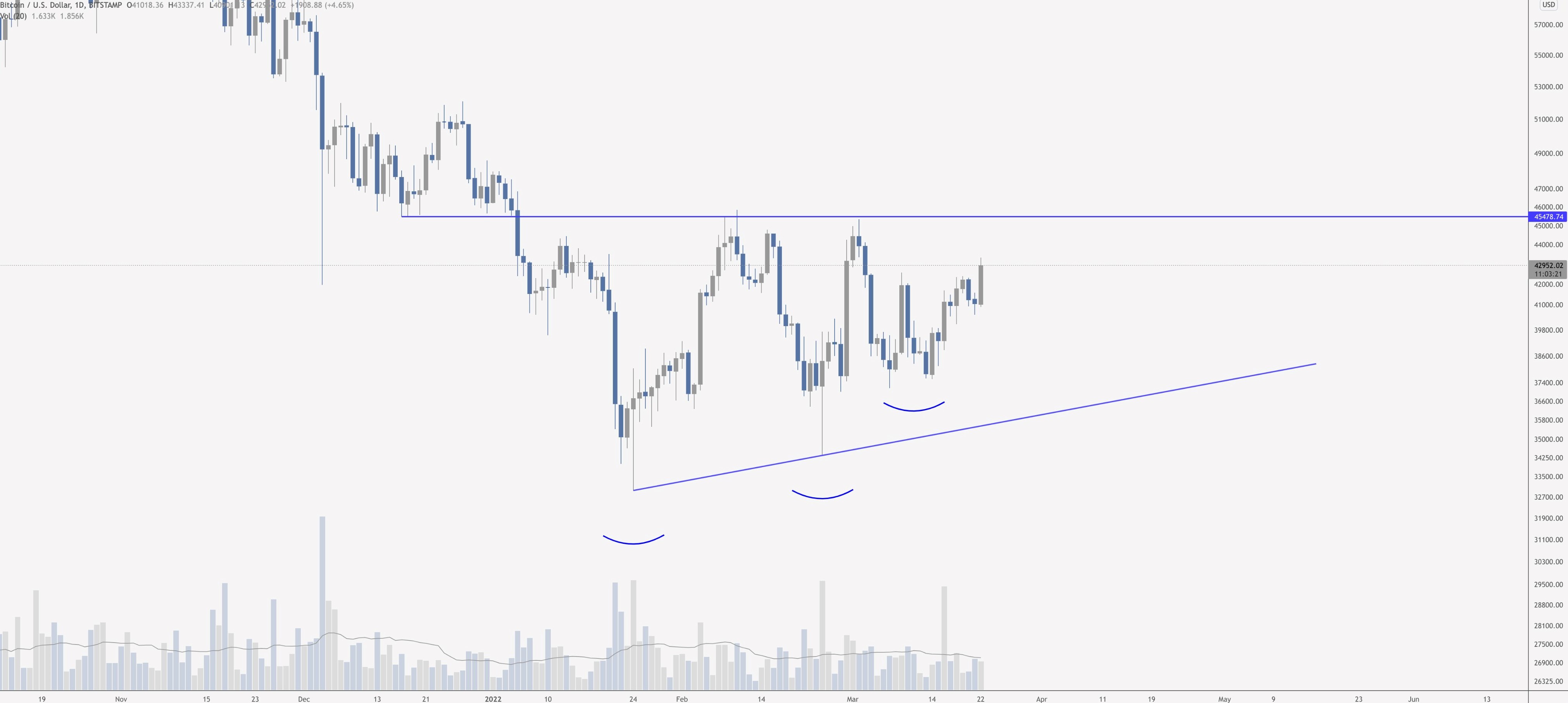 加密货币交易员和 The Wolf of All Streets 播客的主持人 Scott Melker 也强调了 BTC 的上涨趋势,他发布了下图,指出比特币“仍在创下更高的低点,盘整在 45,500 美元左右的关键水平。”
