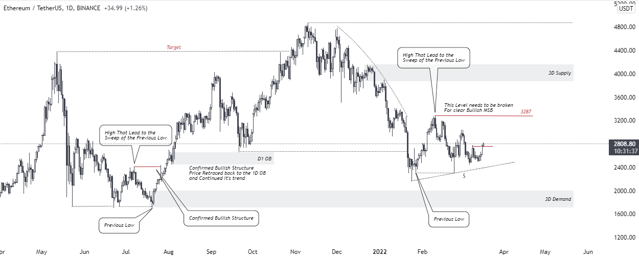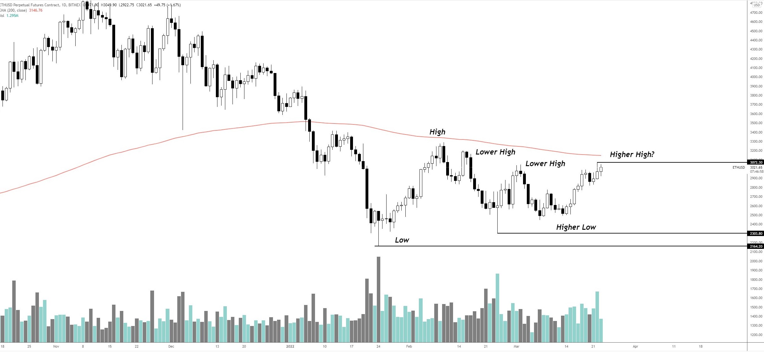 这一前景在很大程度上得到了加密货币顾问和匿名 Twitter 用户“Altcoin Sherpa”的回应,他发布了以下图表,突出了以太坊创造的一系列更高的低点和更高的高点。