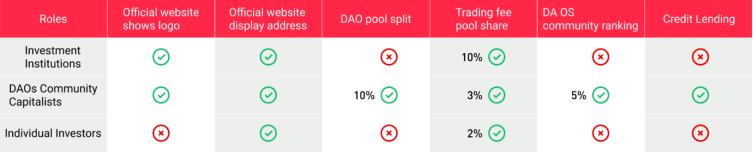投资额度 1000BUSD 起,可以获得交易税中 (BUSD+BHO)3% 的翻倍回报,回报期结束后,收益将停止。投资成功之后将会默认成为一名相当于 DAOs 社区倡导者,会授权相应的邀请连接。通过链接分享可以去组建属于自己的 DAO 社区,DAOs 社区会获得 DAO 池的 10%+交易税的 5% 分成,同时该社区部落的名称和 logo 将会出现在官方的展示区。DAOs 社区可以根据自己最终的信用值获得 VC 池的无抵押信用贷款。DAOs 社区投资人可以编辑自己的名称和 logo,此数据将全部保存到链上