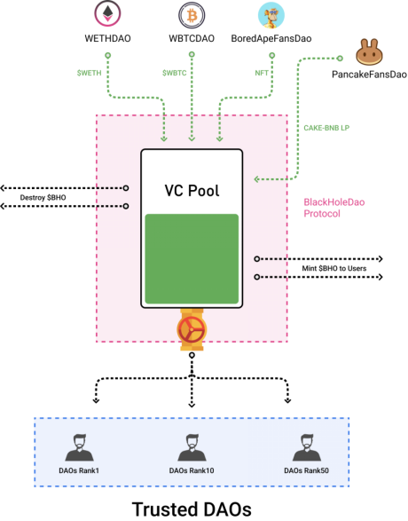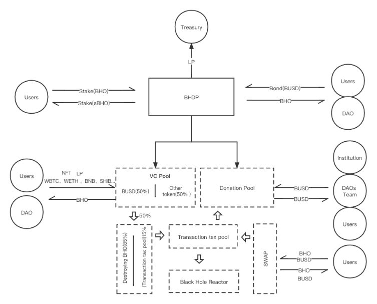BHDP 是 BlackHole DAO Protocol 协议的全名称,从上述图可以看出,协议是由一个国库来支撑,其中智能合约衔接了 VC Pool 和 Donation Pool,VC Pool 支持多资产凭证来投资,其中一部分用于销毁流动性池中的 BHO,另外一部分用于 DAOs 投资成功之后的信用贷,而 Donation Pool 接受投资机构、DAOs 团队即个人 BUSD 直接投资,最终按 BUSD 进行回报,其中 Transaction tax pool 支撑了 Donation Pool、DAOs 社区、Black Hole Reactor 等运作。