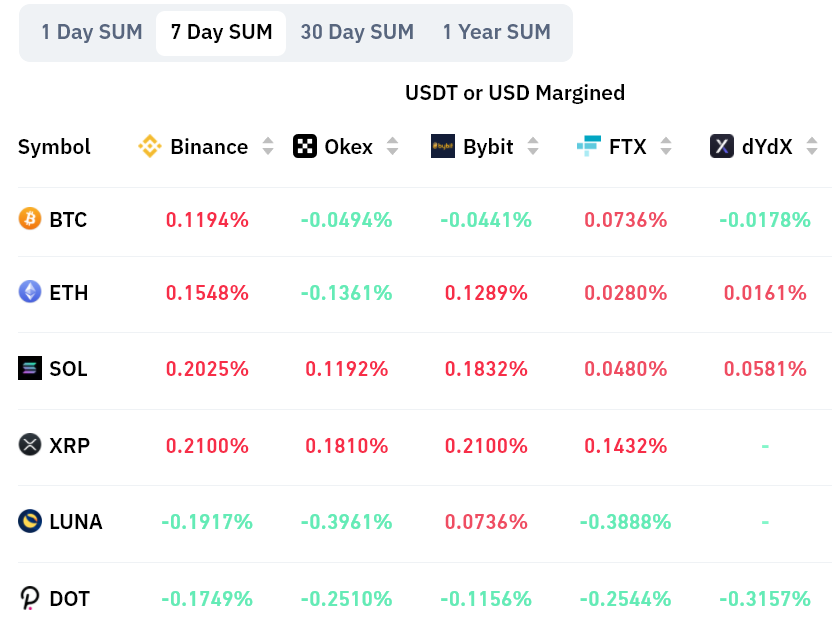 请注意,在大多数情况下,累积的 7 天资金费率是平衡的。该数据表明多头(买家)和卖家(空头)之间的平衡杠杆需求。