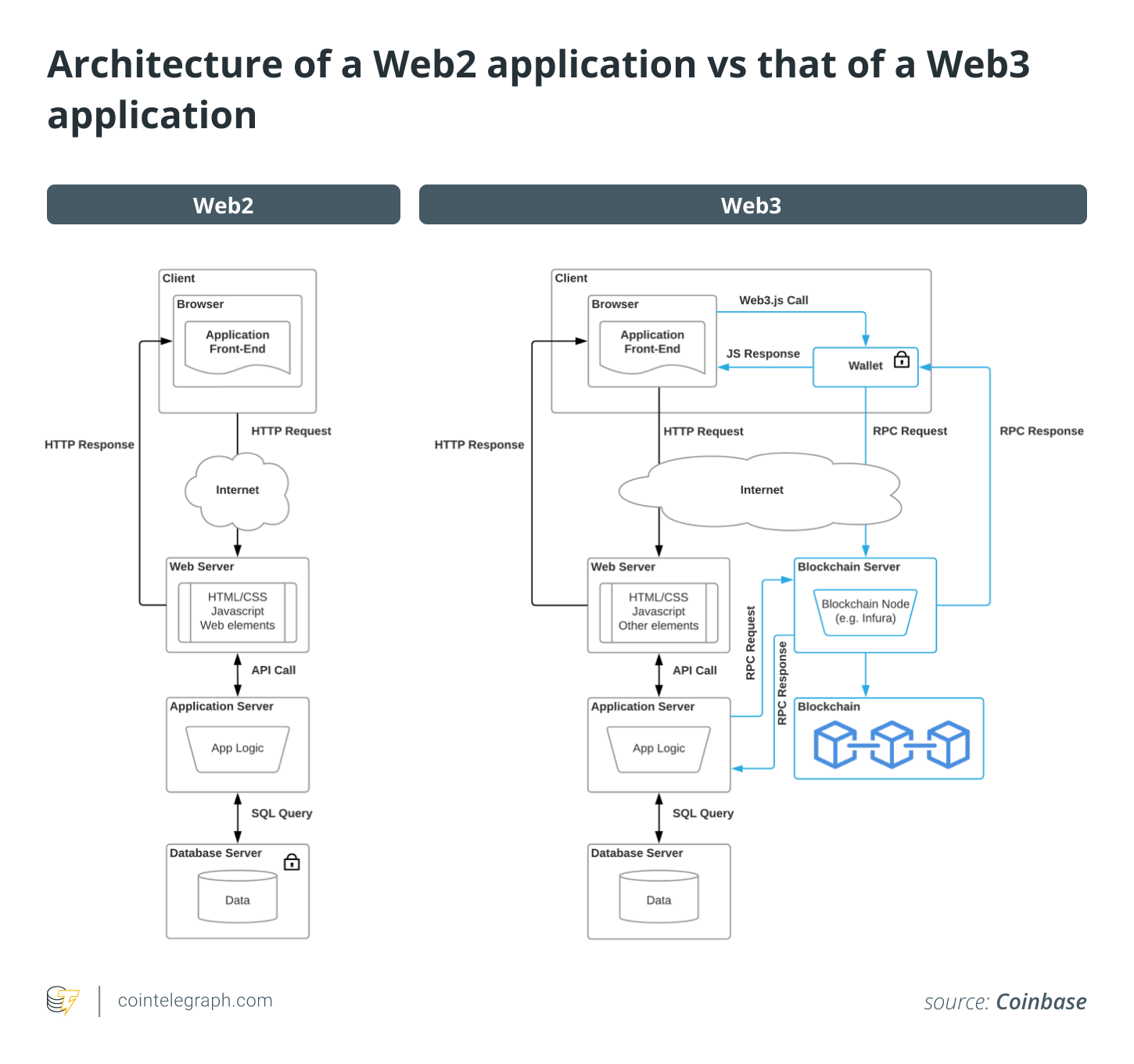 换句话说,Web3是一个基于区块链的去中心化在线生态系统。为了更好地理解这一点,请参见下面的图,以比较Web2应用和Web3应用的架构。