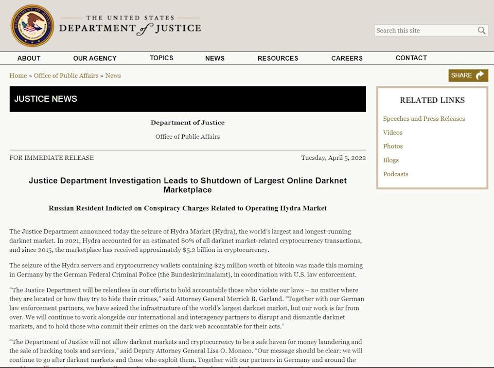 [新头壳newtalk] 美国司法部昨(5)日宣布,与德国联邦刑事警察局(German Federal Criminal Police)携手破获全球最大、最知名的非法交易暗网「Hydra Market」,除将之强制关闭外,德国还查获543枚比特币(价值高达2500万美元、7.2亿台币)的加密货币钱包。