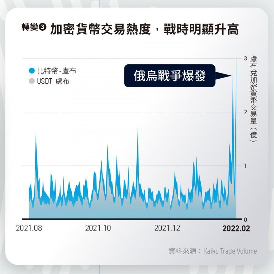 俄罗斯方面,疯狂下跌的卢布币值,推升了民间将资产转成加密货币的动能。保罗表示,在𢧐前和𫔭𢧐一周左右,比特币(Bitcoin)、泰达币(Tether)和卢布之间的交易量大幅攀升,他们希望将卢布转换为加密货币,避免私人财产贬值。