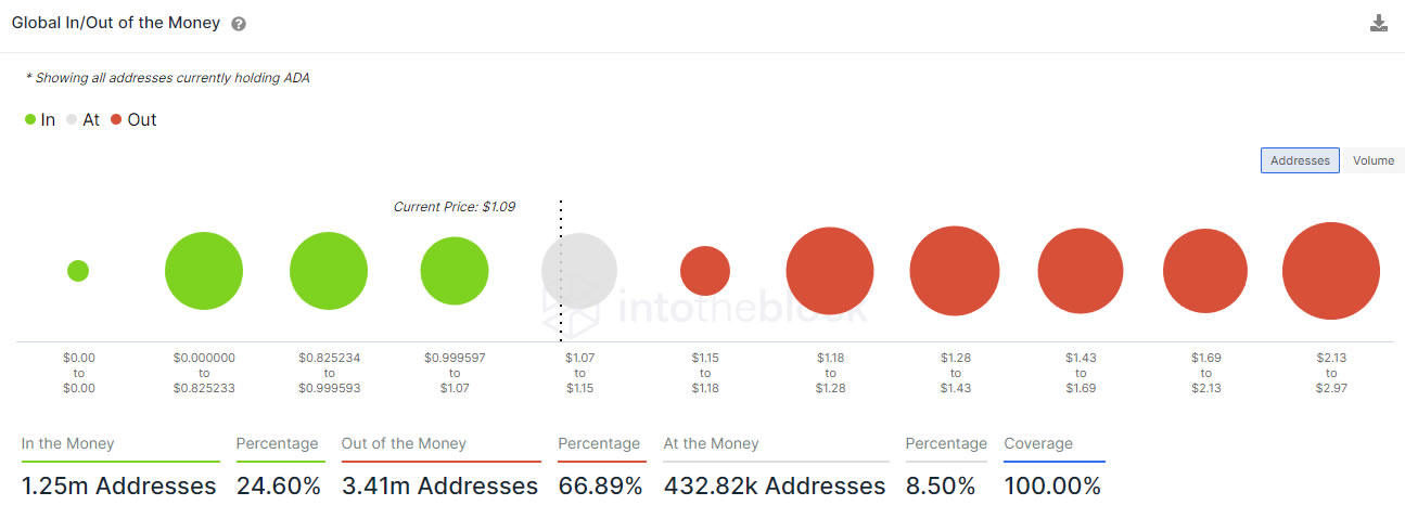 根据 IntoTheBlock 的“资金入/出” 指标,超过三分之二(67% )的 ADA 持有者处于水下状态。四分之一的 ADA投资者处于绿色状态,其中 9% 处于盈亏平衡点。