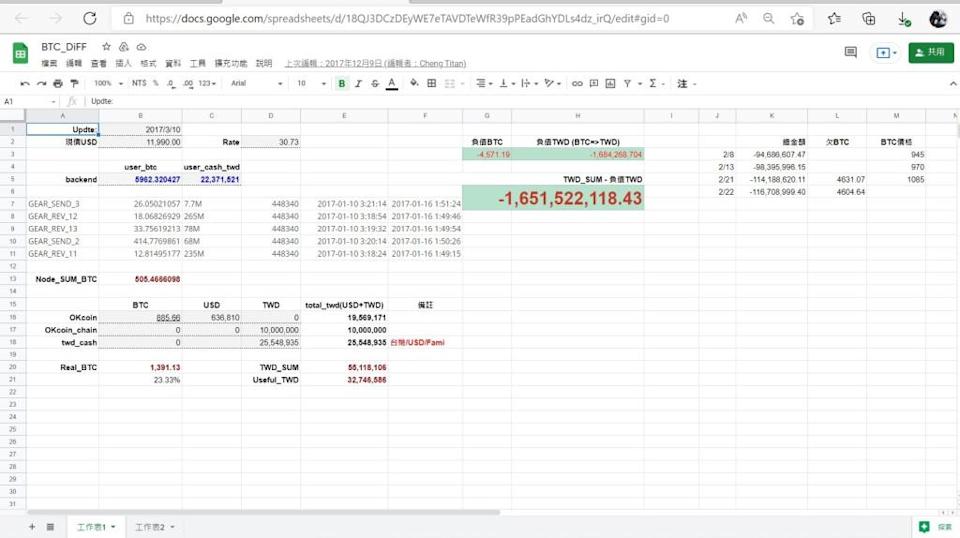 根据记者掌握的资料,一份由郑光泰在2017年12月9日编辑的Excel表格内,清楚记载了币讬公司亏损的比特币高达4,571颗,以当时的价格换算成台币,亏损缺口高达16.5亿元。据了解,事发后币讬公司不断试图弭平,在2年的时间裡面,一度将亏损降至1,000多颗比特币。