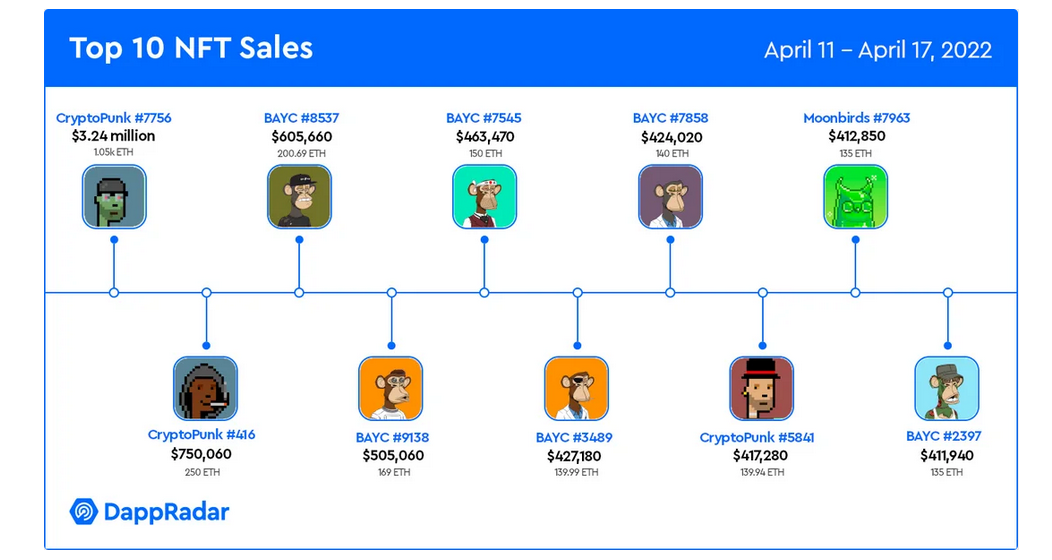 DappRadar 还强调,Moonbirds #7963 NFT 在过去一周以 135 ETH(410,000 美元)的价格获得了所有 NFT 收藏品的第九大销售额。