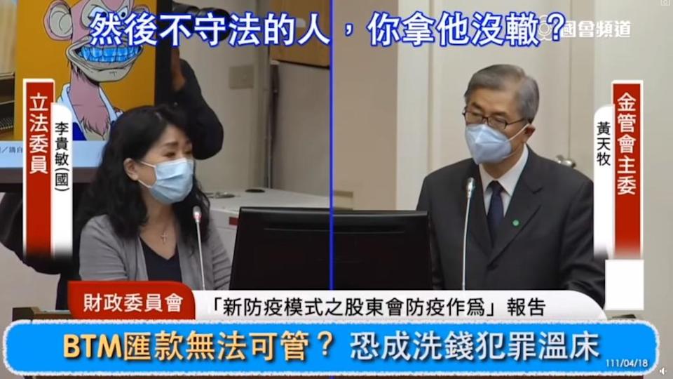 李贵敏表示,这部分的洗钱防制工作不正是金管会主管业务吗?虽然金管会说,已去函要求BTM业者4月底前回报,不改善就罚款;但到现在还在处理业者註册问题?虽然后知后觉好过不知不觉,但那些BTM没有列管的,或相关类型犯罪或诈骗,政府能不能有个政策、对策出来?