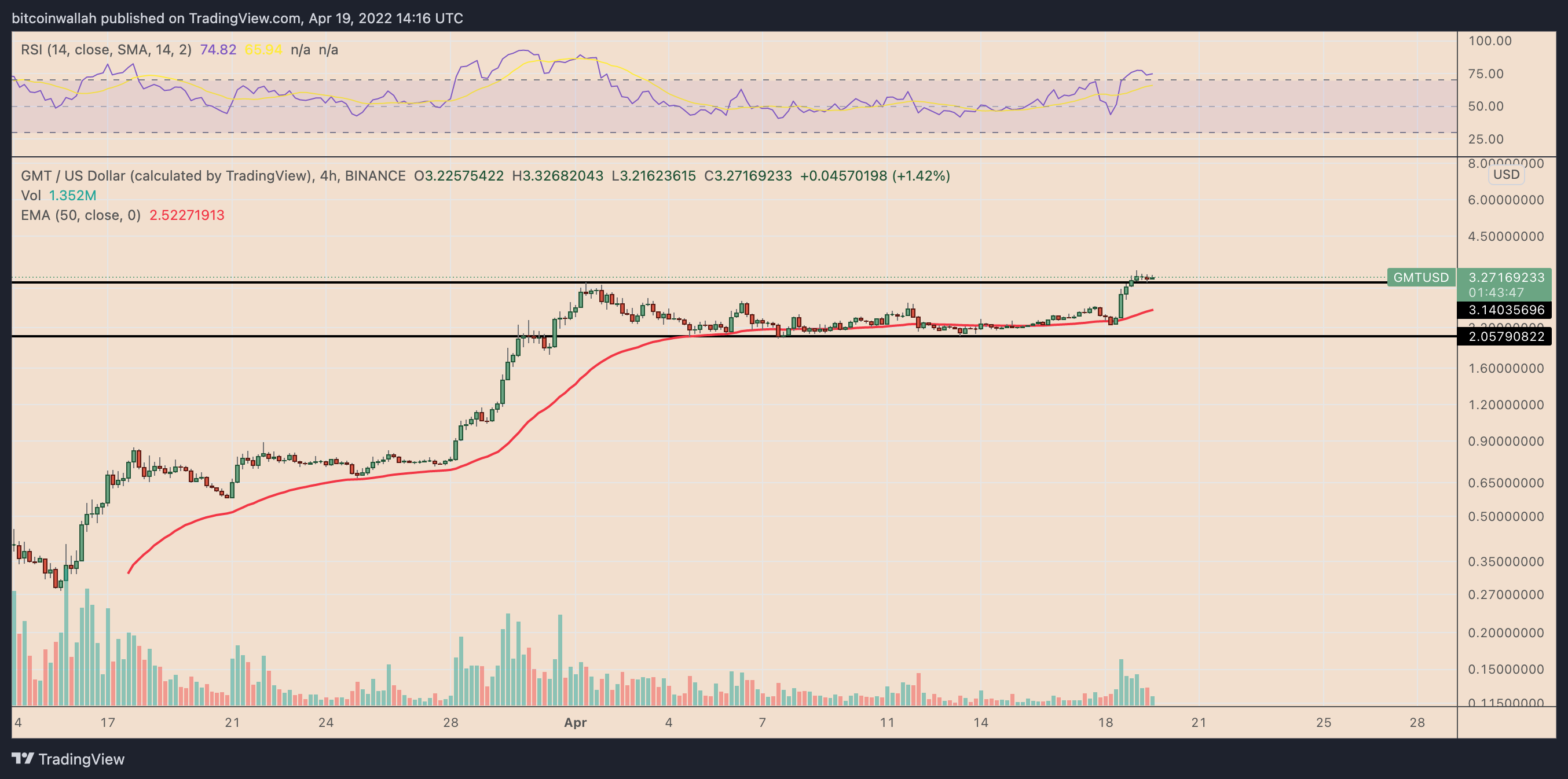 GMT 的价格从 3 月 9 日的 0.01 美元跃升至 4 月 19 日的 3.45 美元的历史新高——在短短 41 天内上涨了 34,000%(数据来自币安)。其大幅上涨趋势的出现主要是由于围绕去中心化金融(DeFi)项目的炒作,该项目以代币奖励保持活跃的用户。