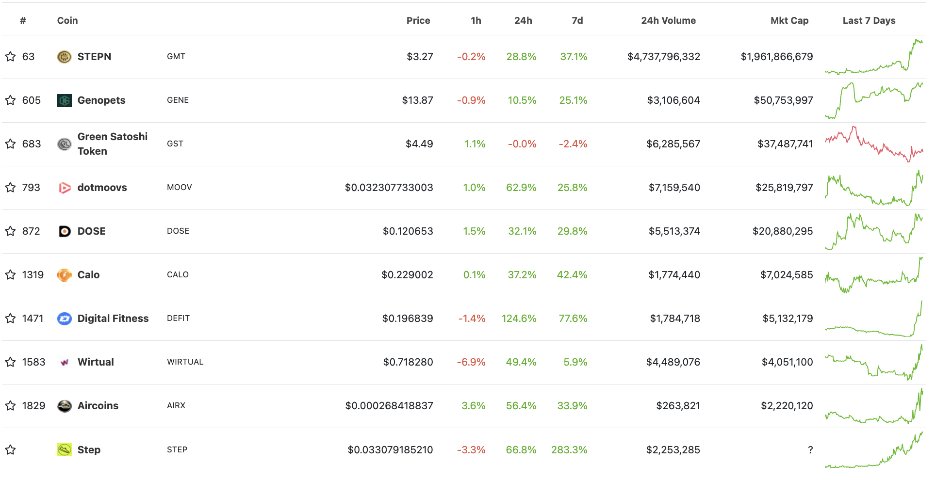 例如,CoinGecko 的数据显示,GMT 及其主要竞争对手(包括 Genopets (GENE) 和 dotmoovs (MOOV))的价格在24小时时间框架内大幅上涨。