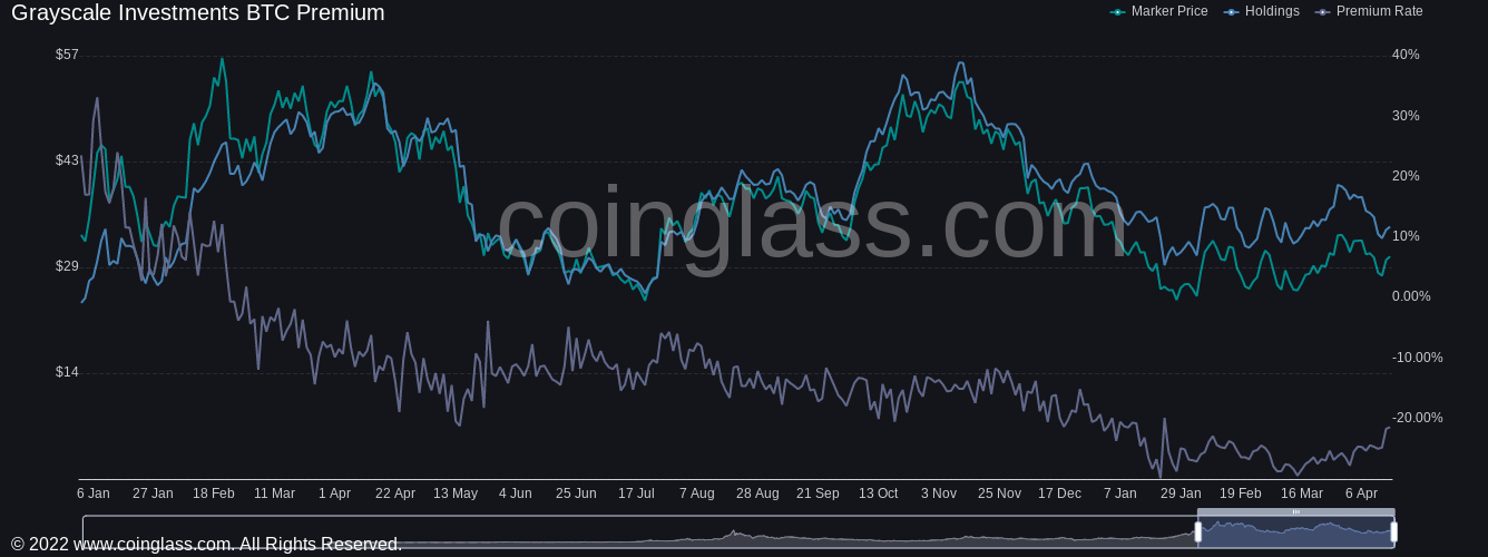 GBTC溢价vs.资产持有量vs.BTC/USD图表 来源:Coinglass