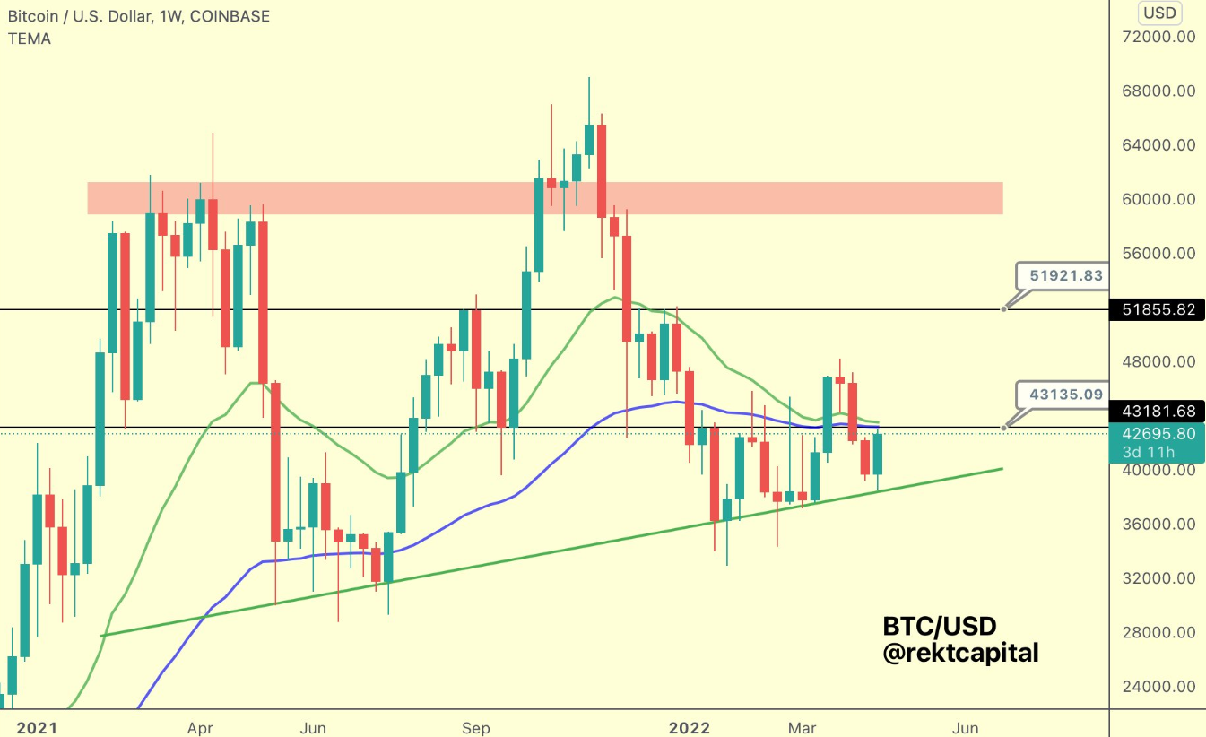 加密交易员和匿名 Twitter 用户“Rekt Capital”讨论了对比特币每周价格走势的分析,他发布了以下每周图表,指出“比特币现在徘徊在绿色的 21 周和蓝色的 50 周看涨指数移动平均线( EMA)下方。”
