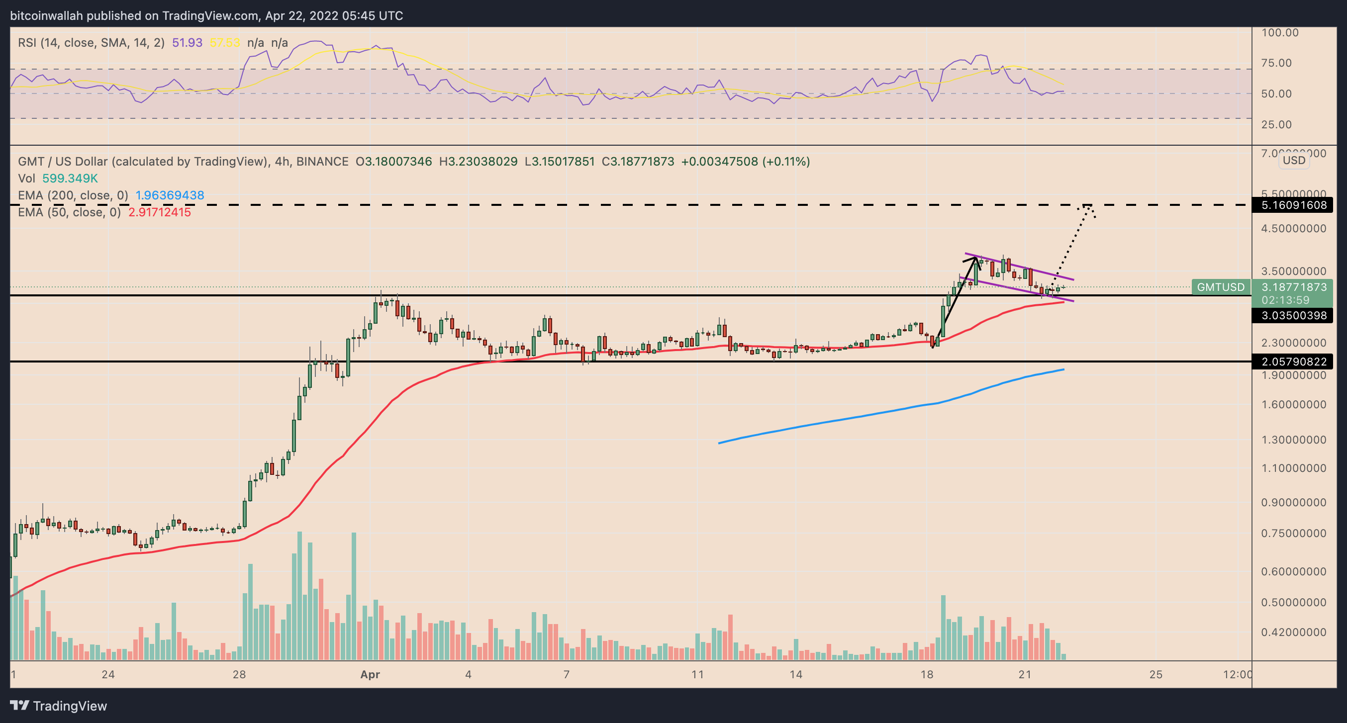 一般来说,交易者通过测量前一次上升趋势的高度并从突破点开始预测来实现牛旗目标。GMT图表上的经典形态显示,它目前着眼于5美元上方,比当前价格高出约65%。
