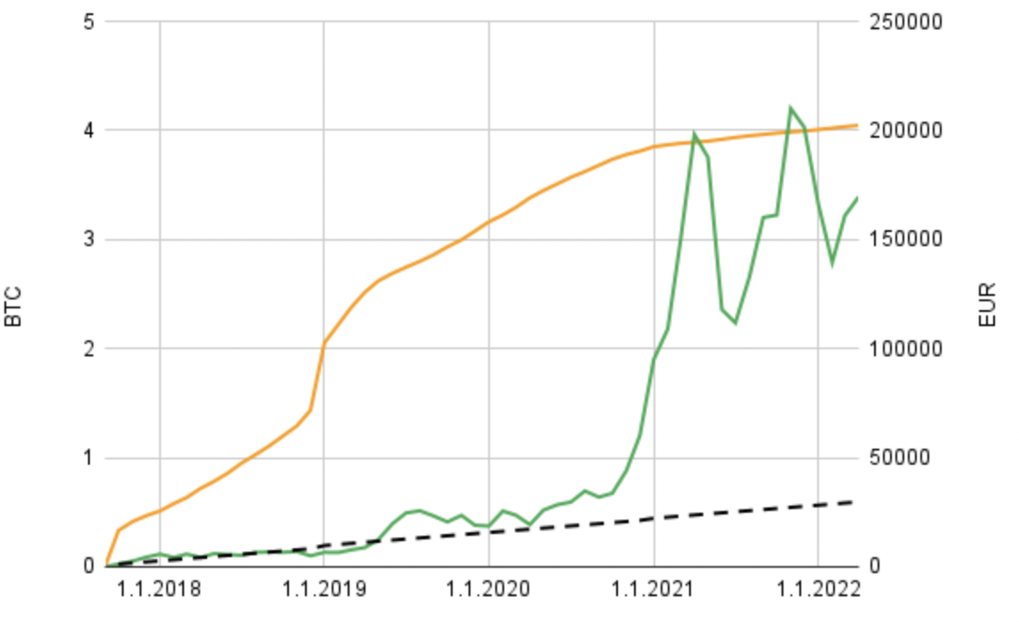 比特币价格(绿色)与以欧元计的退休储蓄(橙色),以及迄今为止投资的现金数量(虚线)。来源:Early Retirement by Bitcoin