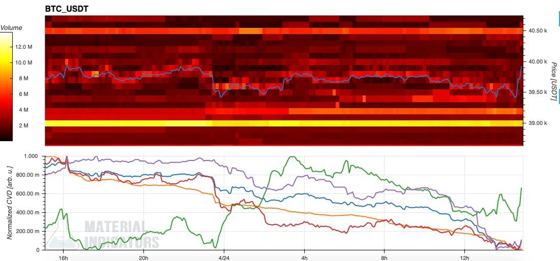 与此同时,链上监控资源 Material Indicators 的数据显示现货价格下方的买盘减少,但仍继续测试4万美元的阻力位。