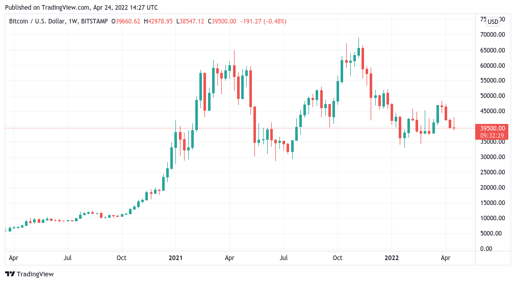比特币(BTC)在 4 月 24 日保持在 40,000 美元以下,这让每周收盘看起来对多头来说是一个痛苦的收盘价。