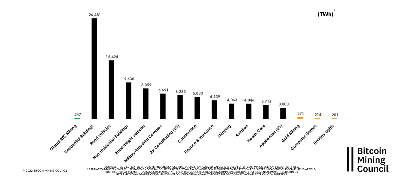 这份报告按行业细分了估计的总能源使用量,声称全球比特币挖矿业务使用 247 太瓦时 (TWh),不到黄金开采业务消耗的一半,与世界总能源使用量相比为 0.16%。