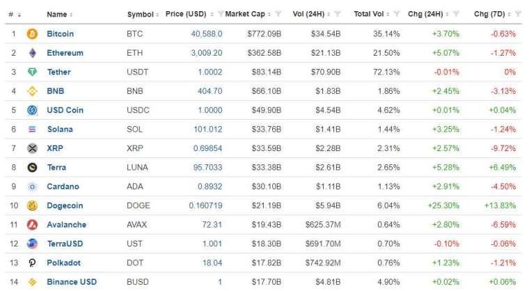 据 Coindesk 报价,截至台北时间周二 (26 日)13:14,比特币 (BTC) 报 40558 美元,重回 4 万美元上方,24 小时涨 3.7%,以太币 (ETH) 也收复 3000 美元关卡,报 3009.2 美元,上涨 5%。主要币种中,涨幅最凶的自然是狗狗币,24 小时疯涨 25%,市值重回前十大加密货币。