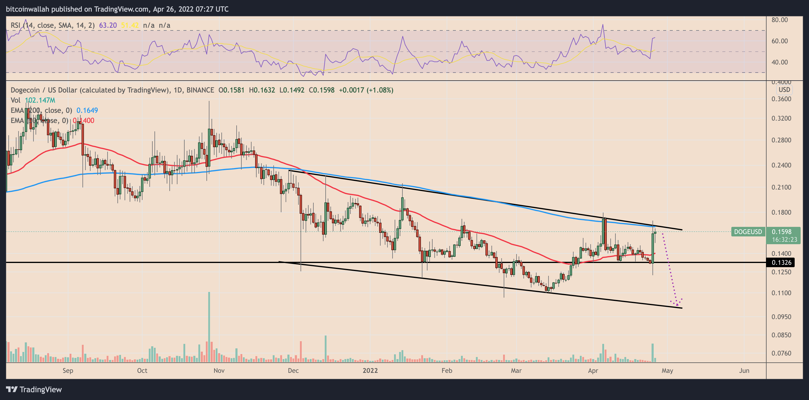 有趣的是,这条线构成了下行通道模式,这增加了DOGE在第二季度末将回调幅度再扩大35%-40%的可能性,如下图所示。