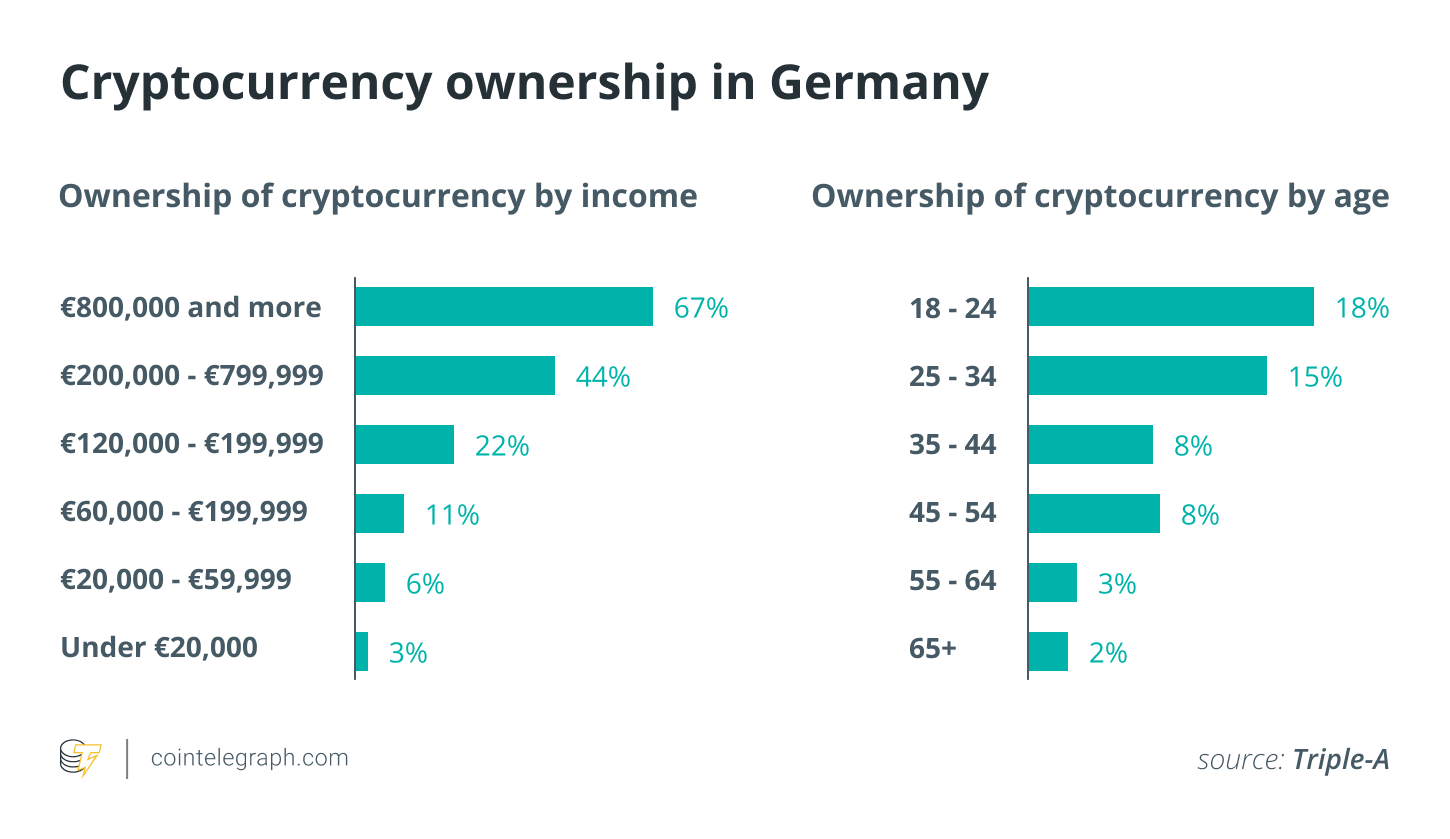 截至2021年底,约2.6%的德国人使用加密货币。根据KuCoin最近的一份报告,44%的德国人有投资加密货币的意愿。
