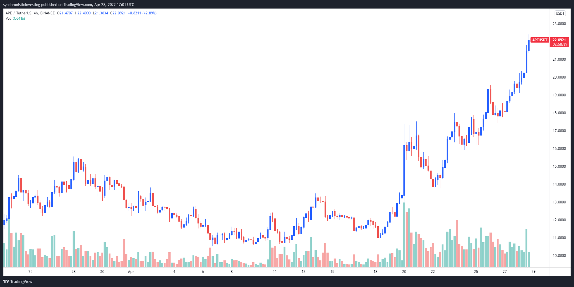 NFT和元宇宙行业一直是 2022 年横盘走势的加密市场的亮点,APE 代币在 4 月 28 日创下历史新高 22.60 美元就证明了这一点。