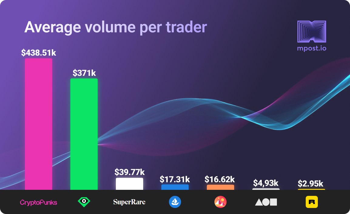 CryptoPunk是最令人垂涎的NFT收藏之一,其中一些NFT卖出了历史最高价。因此,CryptoPunk的平均价格超过10万美元并不令人意外。每个交易员的平均交易量超过40万美元,是以太坊市场中最高的。