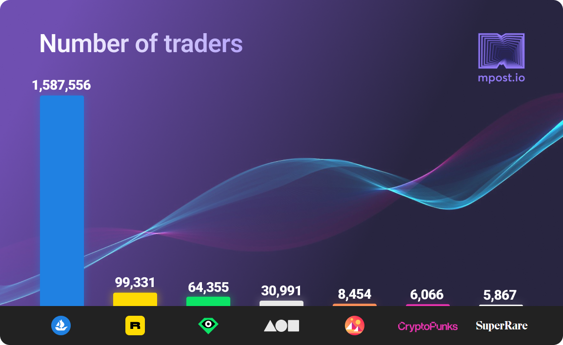 就交易者数量而言,OpenSea也是绝对的市场领导者:拥有超过150万的用户,远远超过LooksRare和Rarible。艺术和元宇宙市场,以及LarvaLabs的CryptoPunks等主要市场的用户也较少,因为它们比OpenSea更专业。